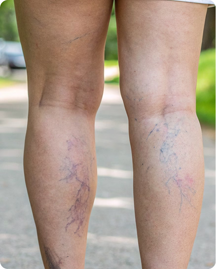 Spider veins are small, thin veins visible just beneath the skin’s surface that often appear in a web-like pattern. Like varicose veins, they develop due to malfunctioning or incompetent valves within the veins. However, spider veins are smaller in size and located closer to the skin’s surface compared to varicose veins.